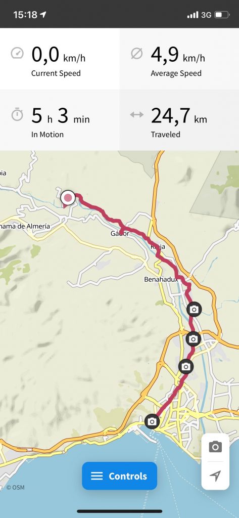 De hitte, tja, het was te doen, zelfs voor deze halve Scandinaviër. Er stond een lekker windje ook. Ik denk dat het kwik in die laatste km’ers rond de 32C was. Maar tot aan de middag was het zeker te doen. Groot nadeel van Spanje is wel dat het water niet te drinken is. Enorme chloor smaak. Uit lekkere noodzaak koop ik nu dus maar iedere keer 1,5 liter water die ik overgiet in mijn eigen flessen. Wel zonde van dat plastic, wat een waste…