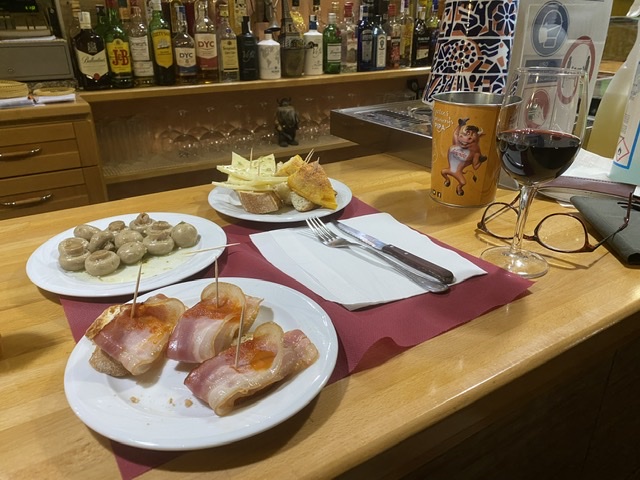 Na een warme douche in de ijskoude albergue is het eigenlijk wel tijd om iets te eten. Maar Spanje hè. Dat gaat niet voor een uur of acht. De enige bar is een anderhalve kilometer en een dorp verderop. Ik besluit toch maar even te bellen of ze open zijn en si is het antwoord. Ik word buiten al welkom geheten door de vriendelijke eigenaar. Een voetbalwedstrijd later, wat wijntjes en tapas loop ik in het donker weer terug. Blijf de nacht alleen en ondanks de kou heerlijk geslapen.