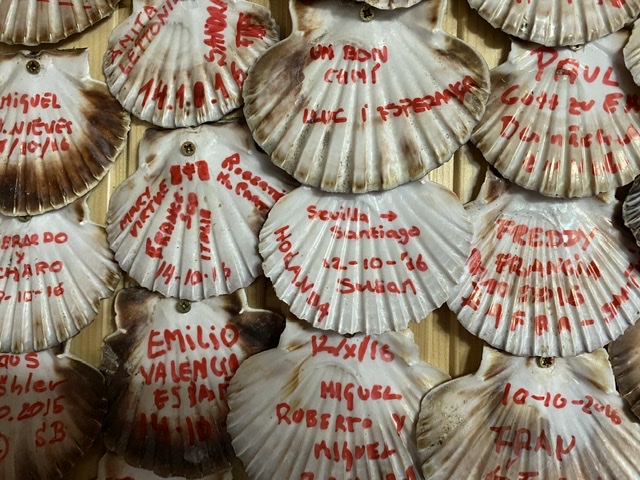 Ik weet al dat ik na deze klim een dorpje tref met daar misschien wel de allerpopulairste bar van alle barren op de Camino. In 2004 begon deze Manolo met jakobsschelpen te geven aan pelgrims om die met hun naam en land en de datum op te hangen in zijn bar. Inmiddels zijn we 17 jaar verder en hangt ook de albergue er vol mee en ik denk dat hij nog een restaurant er bij kan openen voor de schelpen inmiddels. Uiteraard krijg ik ook mijn plekje 💪🏼